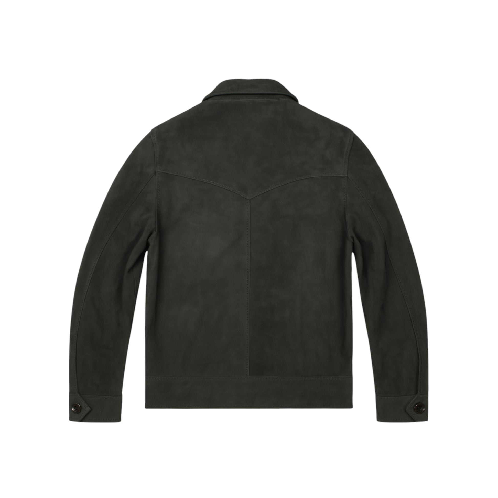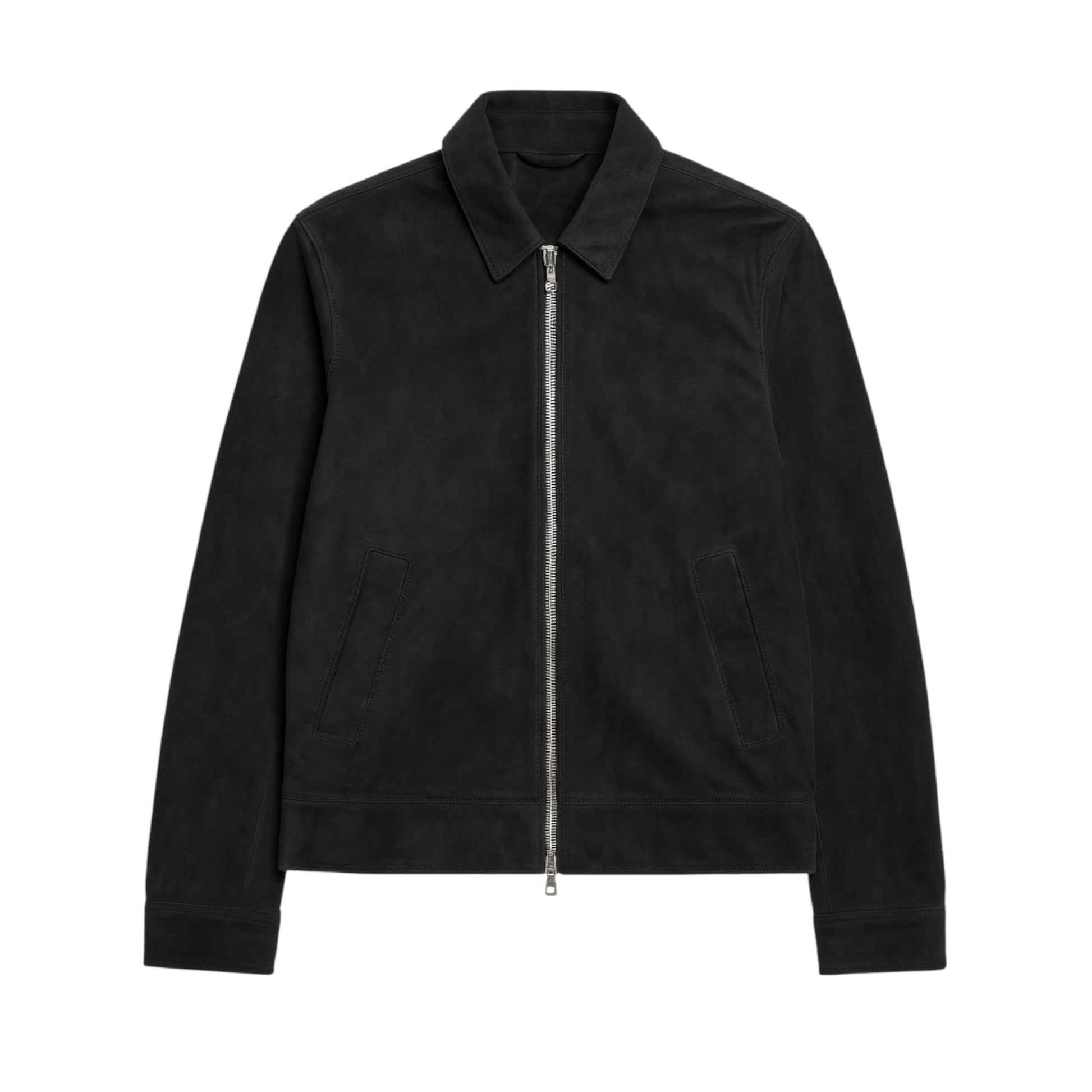 A sleek grey suede leather jacket featuring a classic collar and a front zipper, perfect for adding a touch of sophistication to any outfit.